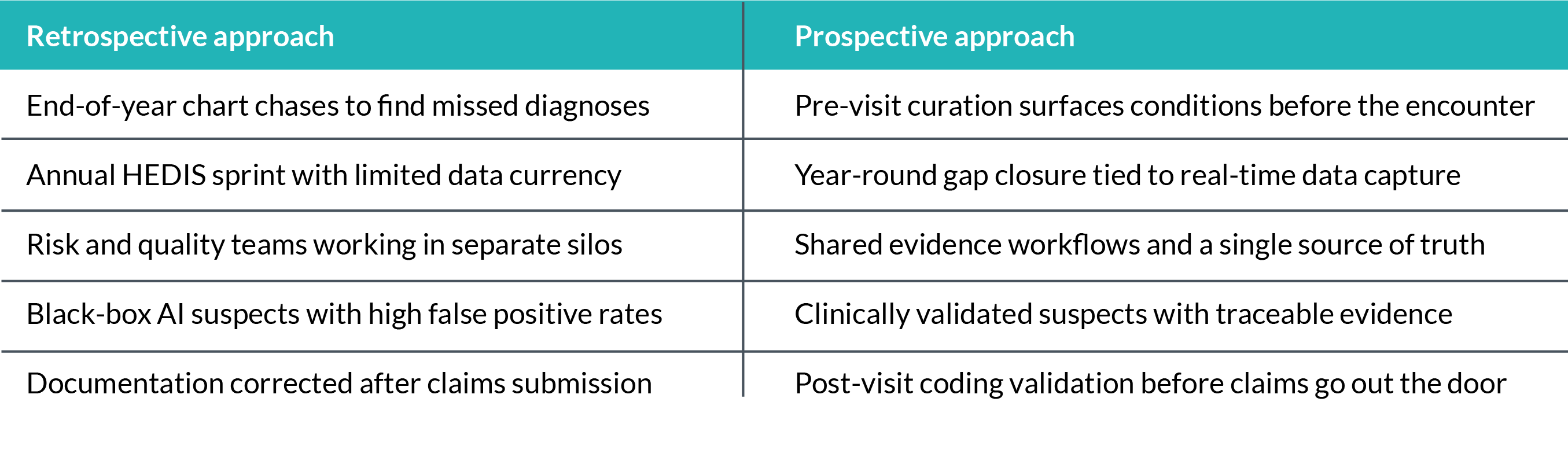 Prospective solutions have to meet providers where they already work. That means pre-visit curation that prepares charts before the encounter, point-of-care EHR advisories that surface the right information at the right moment, and post-visit coding validation that confirms documentation before claims go out the door. The result is audit-ready documentation built as standard practice, not assembled in a scramble during RADV season.