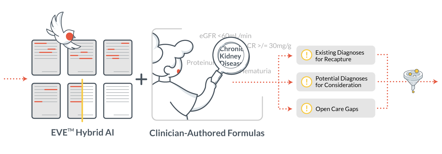 EVE TM Hybrid AI extracts evidence from charts. Clinician-authored formulas then determine conditions that qualify as potential recapture, net new diagnoses, or open care gaps.