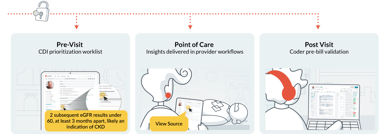 Prospective Risk Adjustment supports CDI pre-visit review, point-of-care insights, and post-visit pre-bill checks. Each encounter becomes a chance to address diagnosis gaps and care gaps in real time instead of chasing issues months later.